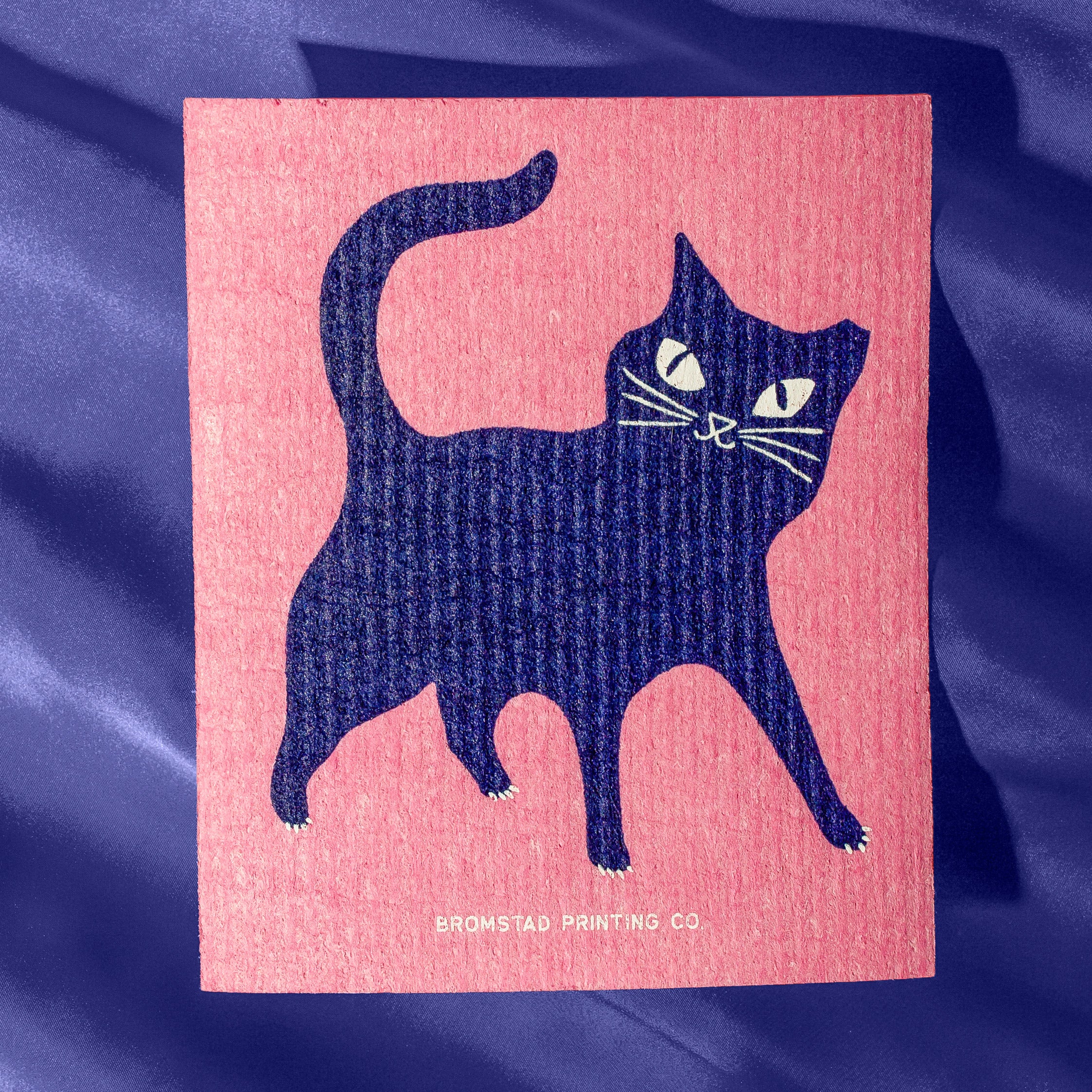 This one features a mischievous black cat with a tipped ear, screen printed in two colors on a pink sponge cloth.