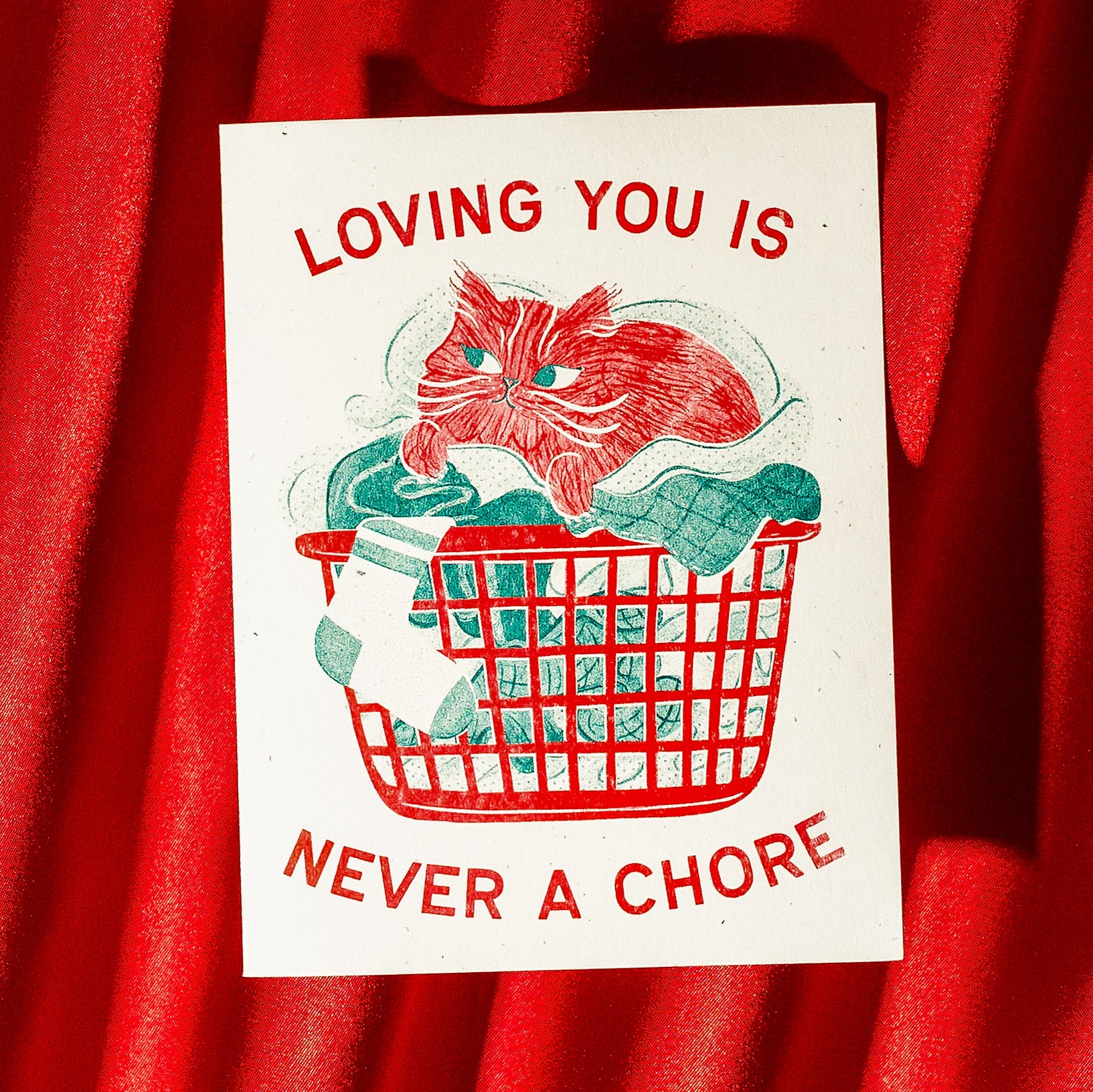 This card is like the warm embrace of fresh-from-the-dryer laundry. Send this to friends and loved ones so they can feel as cozy as this cute cat curled up in sheets and socks. Risograph printed in bright red and teal ink.